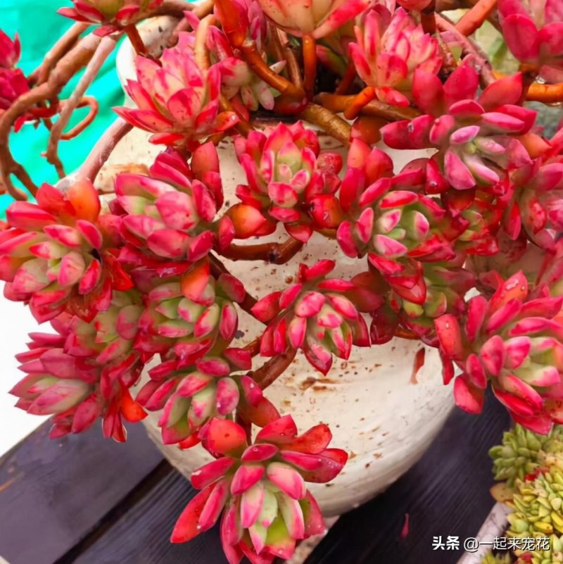 这种红色系的多肉植物是非常好看的,这种植物的茎秆粗壮,容易养成漂亮的小老桩,植株也是莲座状,叶片非常的光滑,只要有充足的光照加上合适的温差,叶片就会变得红彤彤的,非常的迷人。