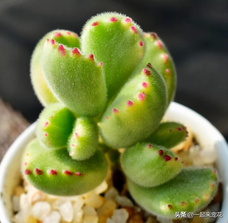 熊童子是一种很可爱的多肉植物,这种多肉的叶片上毛茸茸的,而且叶片边缘红彤彤的,就像是熊爪子一般,特别的可爱。需要注意的是,养护熊童子,千万不可以浇水在叶片上,以免非常容易出现黑腐烂叶的情况。
