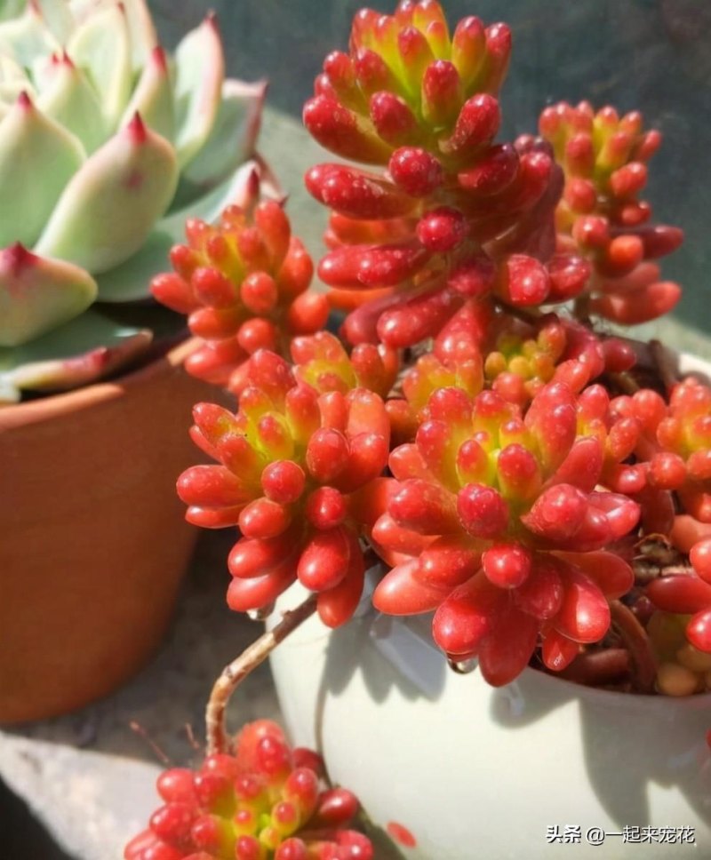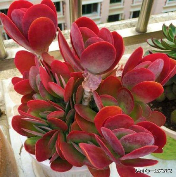 这种红色系的多肉植物是非常好看的,这种植物的茎秆粗壮,容易养成漂亮的小老桩,植株也是莲座状,叶片非常的光滑,只要有充足的光照加上合适的温差,叶片就会变得红彤彤的,非常的迷人。