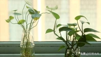 4、水养扦插:绿萝可水养扦插,准备一只花瓶,放些自来水,放在阳光下晒1-2天,去除自来水中的氯气,将绿萝放进去,几天后便可出白白的根了。